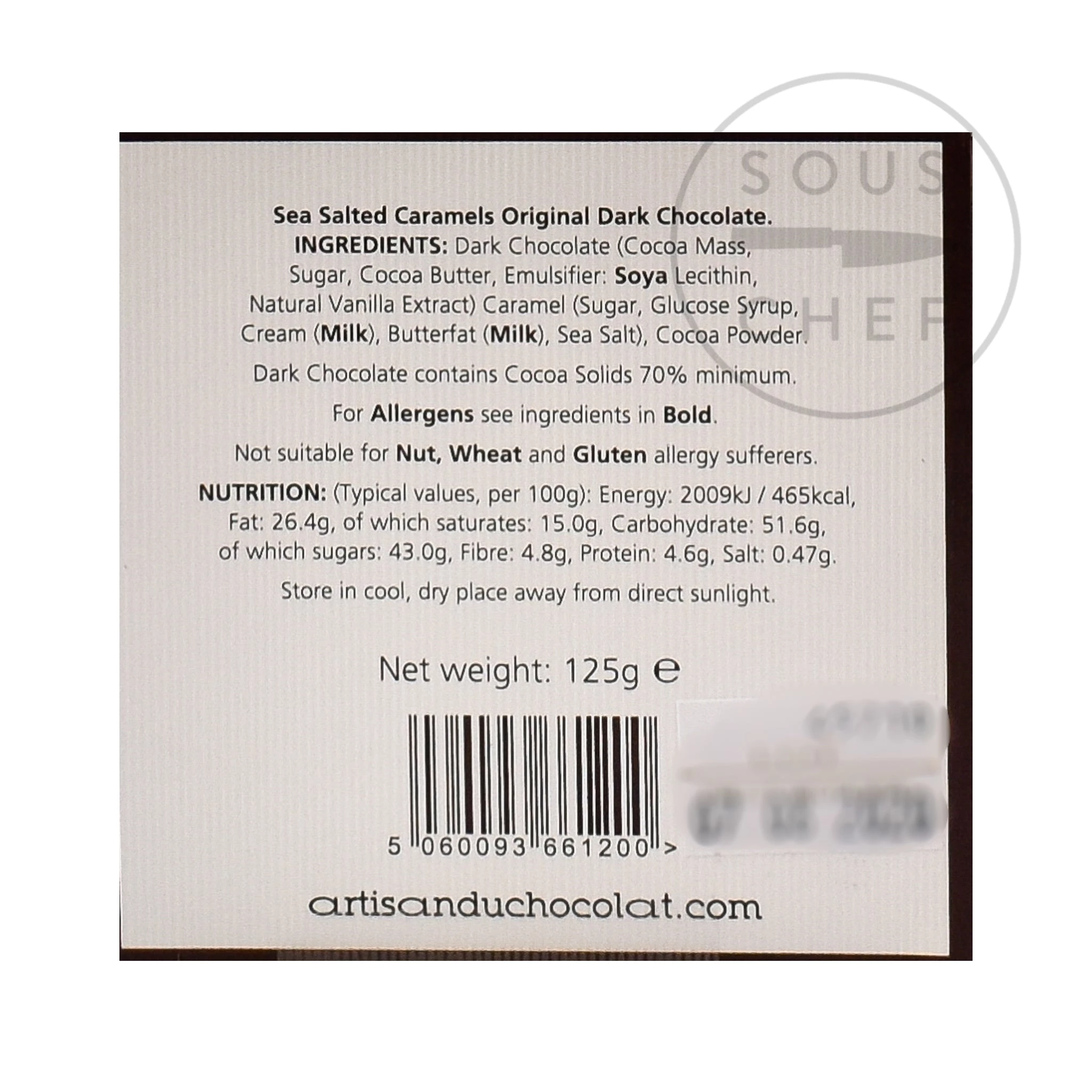 Ingrédients : chocolat noir (fèves de coco, suga de canne)r, beurre de cacao, émulsifiant: lécithine de soja, extrait de vanille), carmael (sucre, sirop de glucose, crème, beurre (lait), sel de mer), cacao en poudre. Contient du soja, du lait et peuvent contenir des traces de noix et de mollusques.