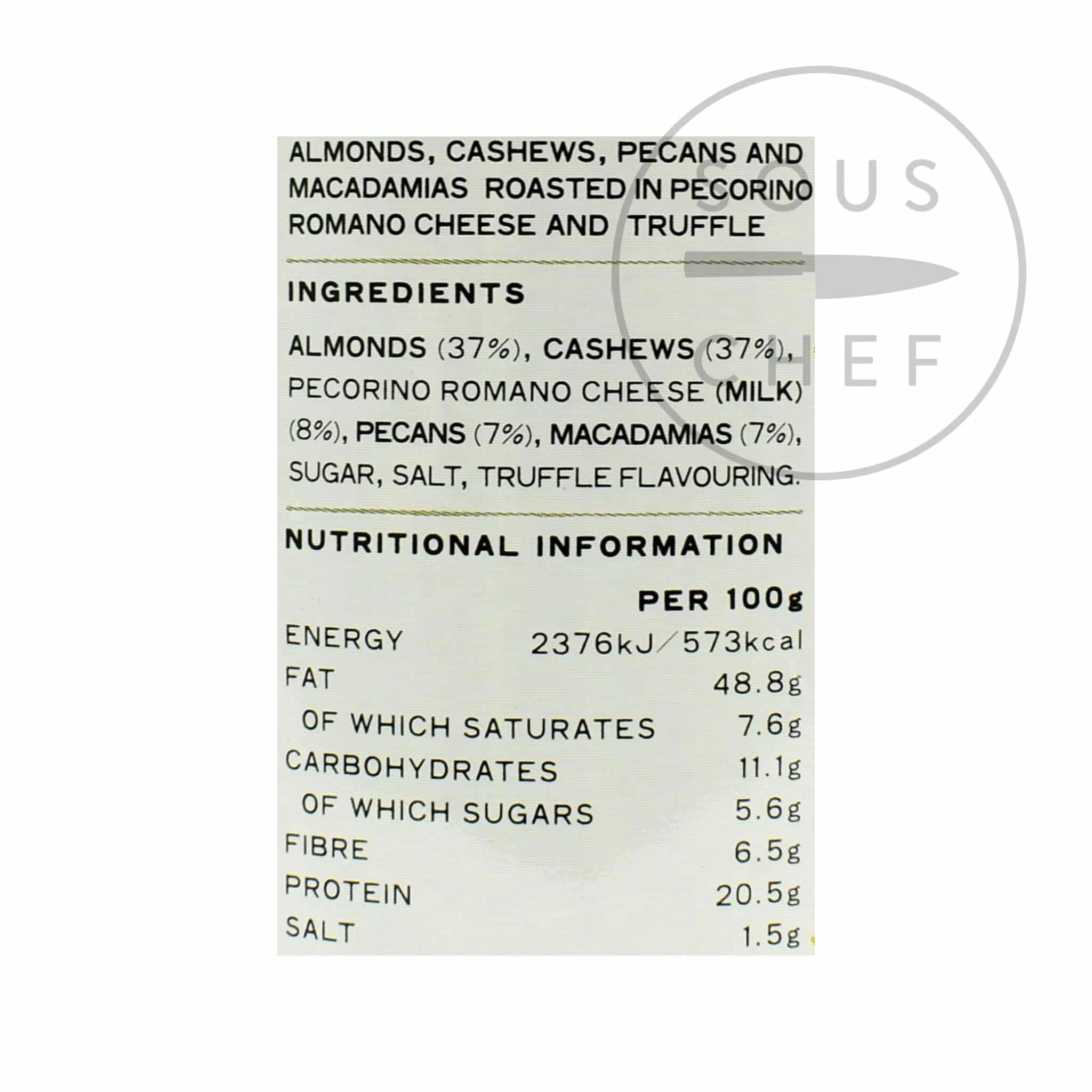 Ingredients: Almond (nut), cashew nuts, Pecorino romano PDO (ewes milk, salt, lamb rennet), pecan nuts, Macadamia nuts, sugar syrup (sugar, water), sea salt, extra virgin olive oil, truffle flavouring.