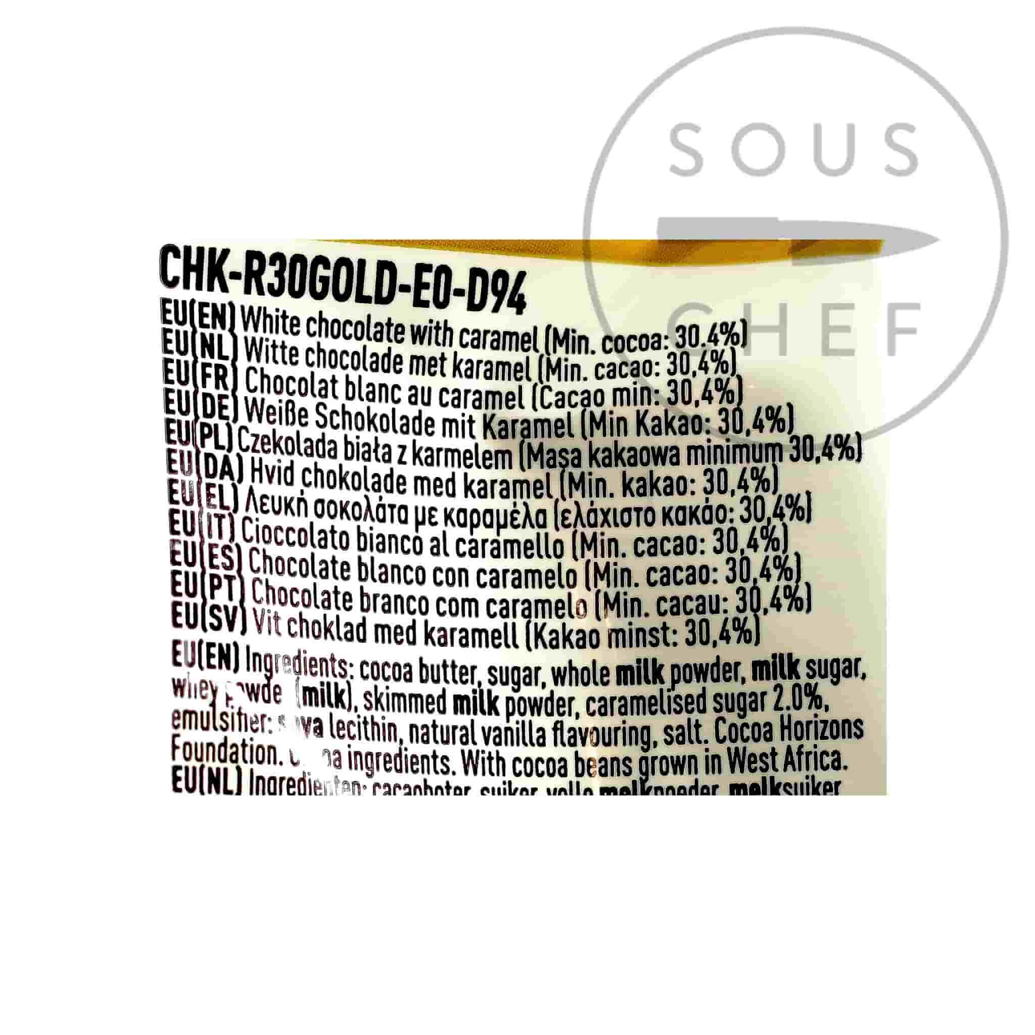 Ce pré-tempéré 30.La couverture caramel de 4% est un mélange de trois haricots différents de la Côte d’Ivoire, du Ghana et de l’Équateur. Fabriqué avec du sucre caramélisé, du lait caramélisé et une saupoudrée de sel, ce chocolat de type caramel a une teinte dorée.