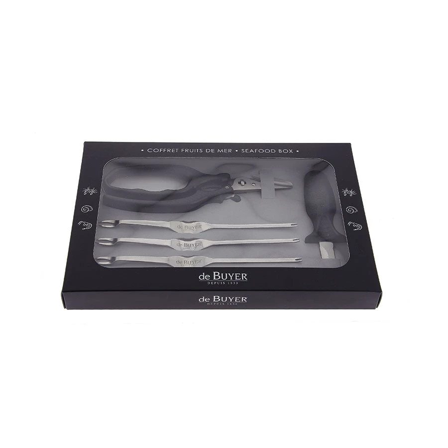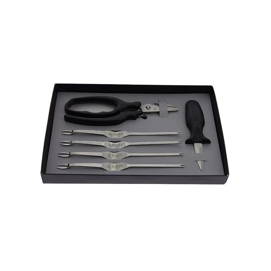 L’ensemble de mollusques De Buyer est livré avec les outils essentiels pour s’attaquer à la plupart des mollusques et fruits de mer. L’ensemble comprend: