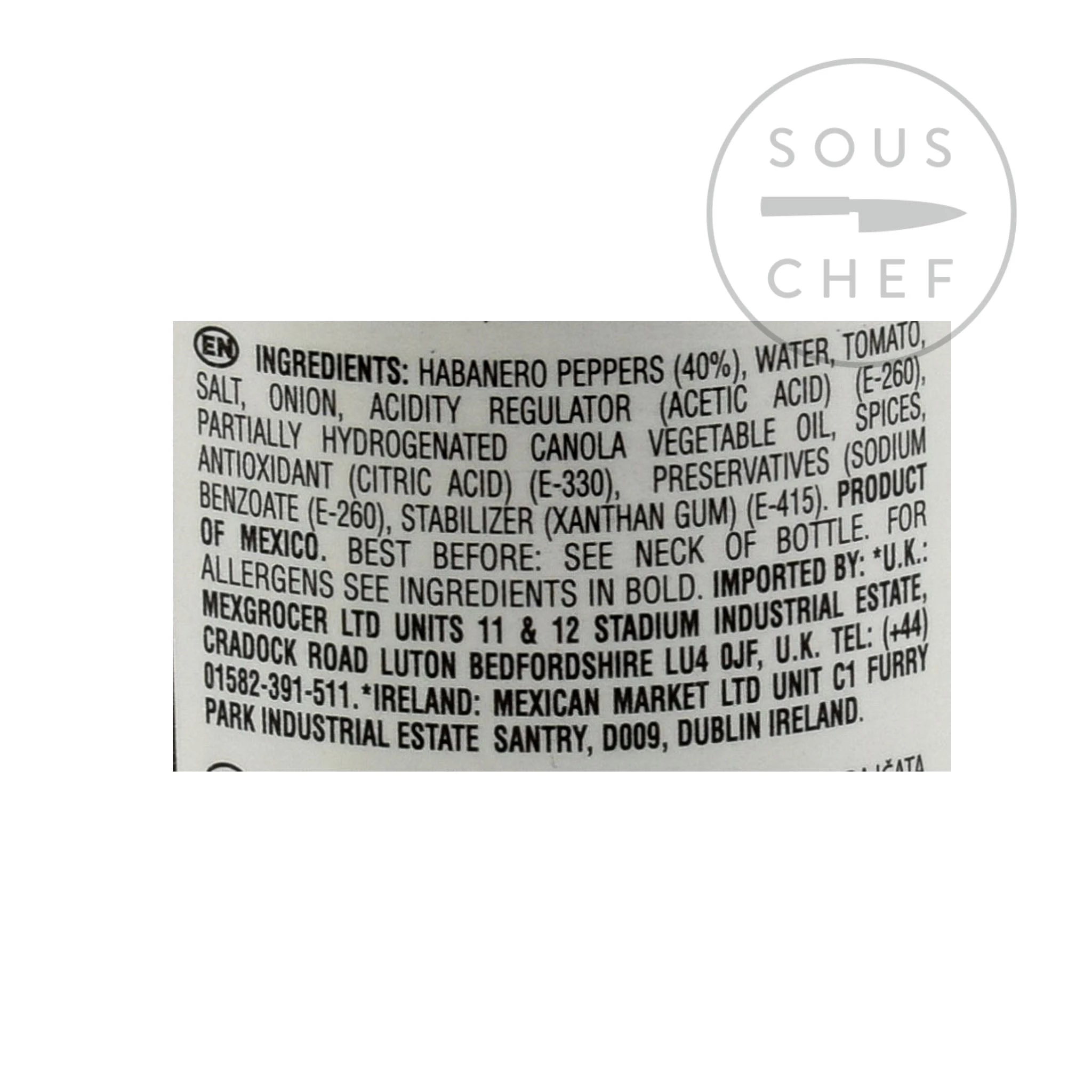 Ingredients: Habanero peppers (40%), water, tomato, salt, onion, acidity regulator (acetic acid) (e-260), partially hydrogenated canola vegetable oil, spices, antioxidant (citric acid) (e-330), preservatives (sodium benzoate (E-260), stabilizer (xanthan gum) (e-415).