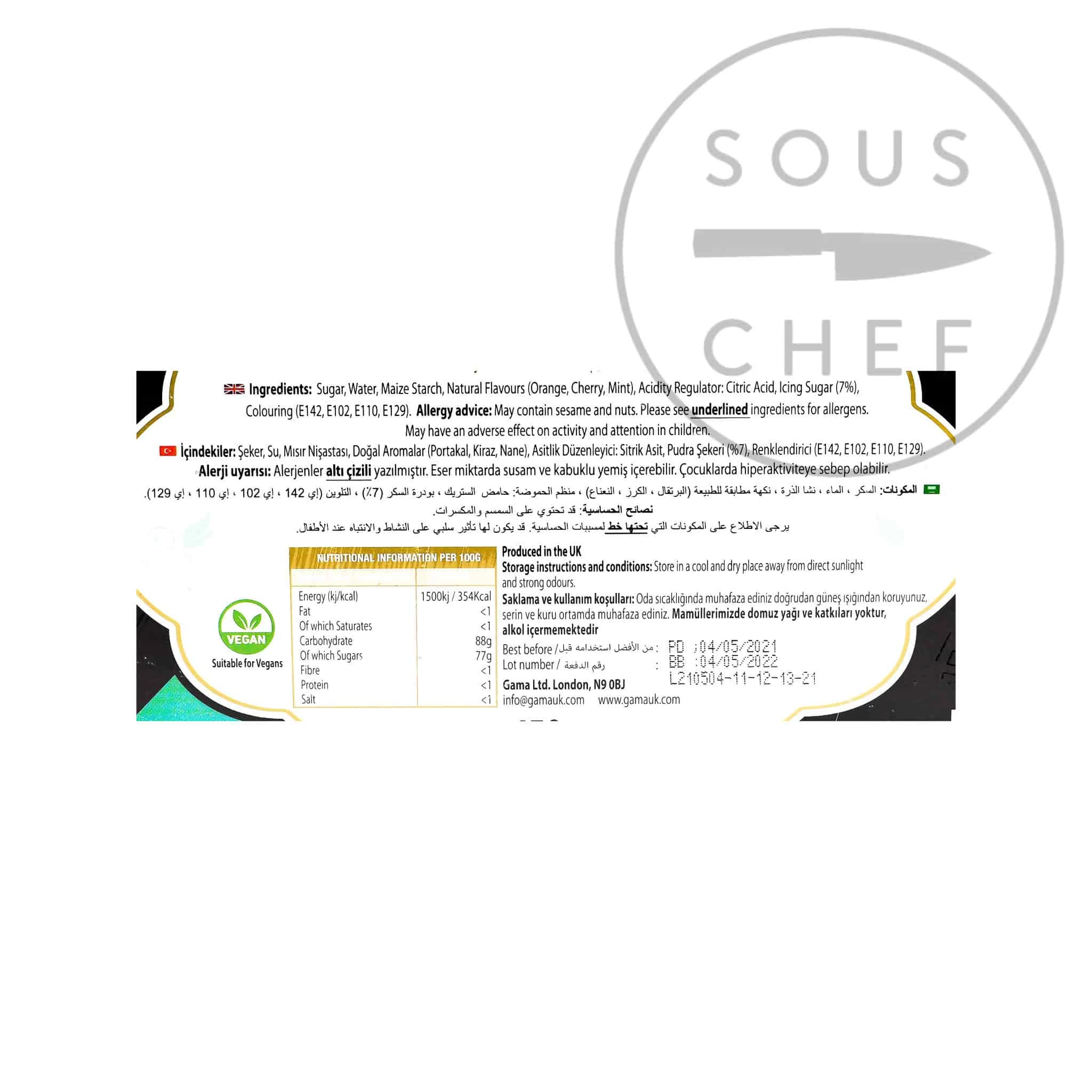 Ingredients: sugar, water, maize starch, natural flavours (orange, cherry, mint), acidity regulator: citric acid, icing sugar (7%), colouring (E142, E102, E110, E129)