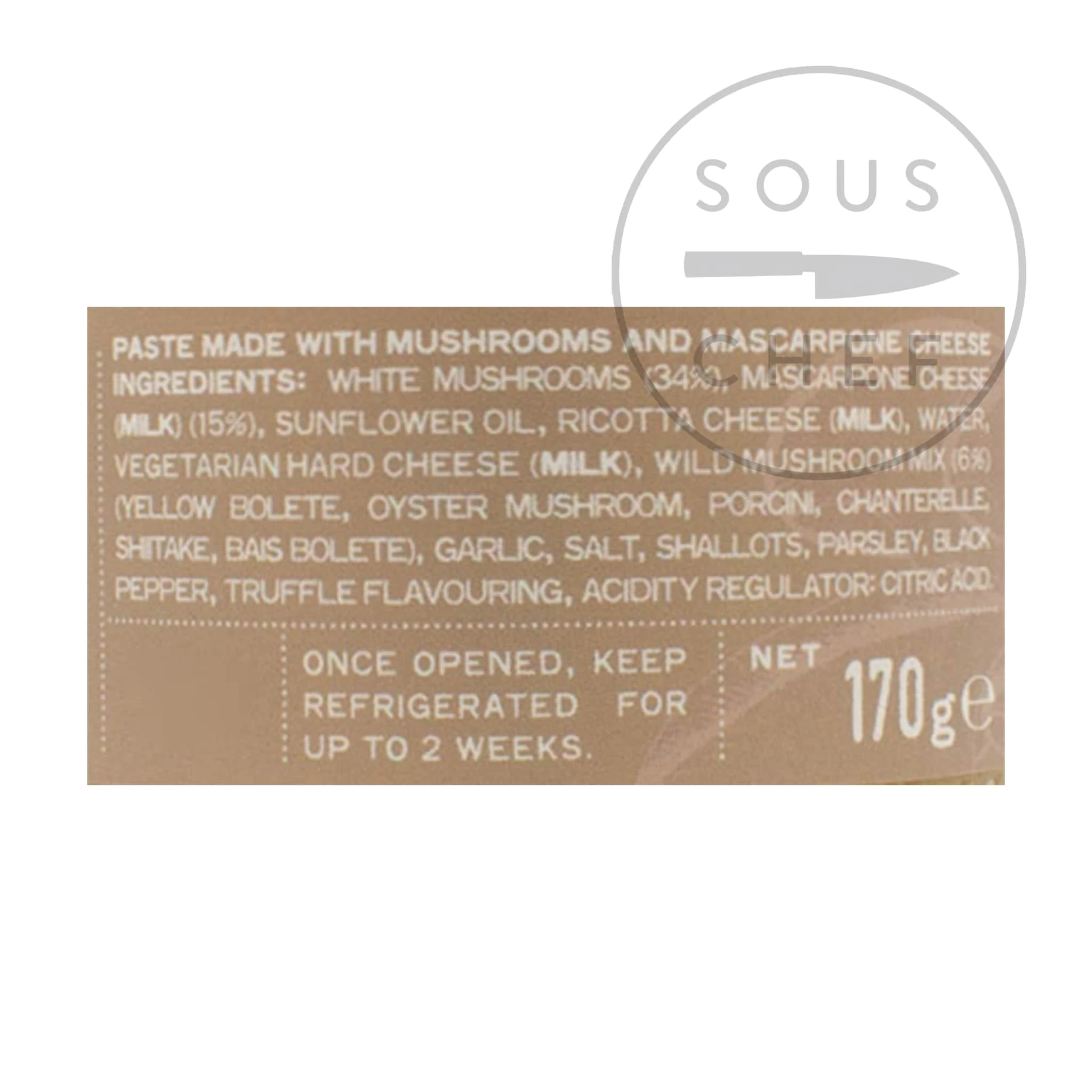 Ingredients: white mushrooms (34%), mascarpone cheese (milk) (15%), sunflower oil, ricotta cheese (milk), water, vegetarian hard cheese (milk), wild mushroom mix (6%) (yellow bolete, oyster mushroom, porcini, chanterelle, shitake, bais bolete), garlic, salt, shallots, parsley, black pepper, truffle flavouring, acidity regulator: citric acid.