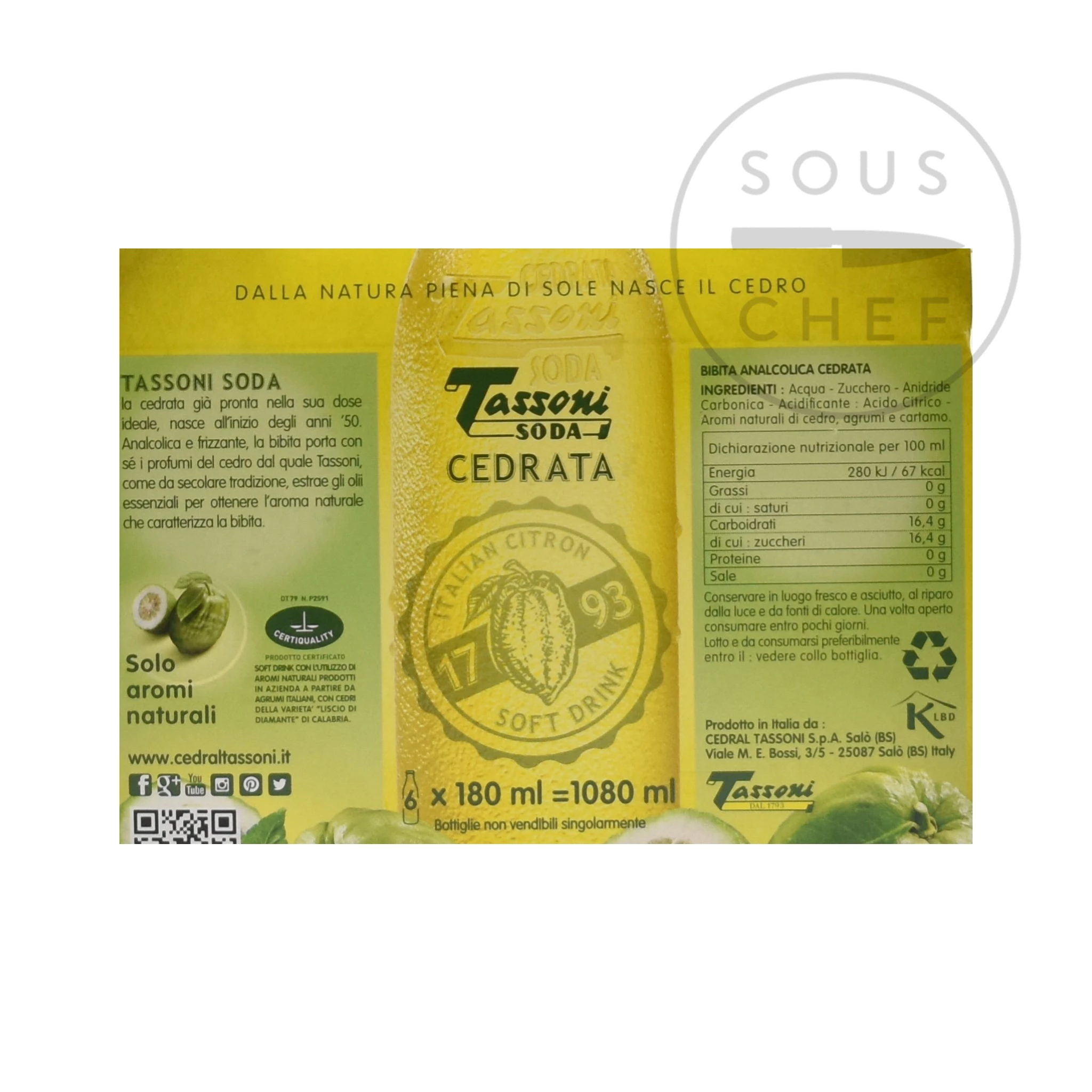 Tassoni Cedrata est une boisson d’agrumes pétillante rafraîchissante et non alcoolique d’Italie. Il a une saveur et un arôme distinctifs qui vient du citron – un agrumes à la peau épaisse, intensément parfumé également connu sous le nom de cedra ou d’érog. Citrons Calabriens, appelé Diamante, sont utilisés pour faire la soda de Cedrata douce et pointue.