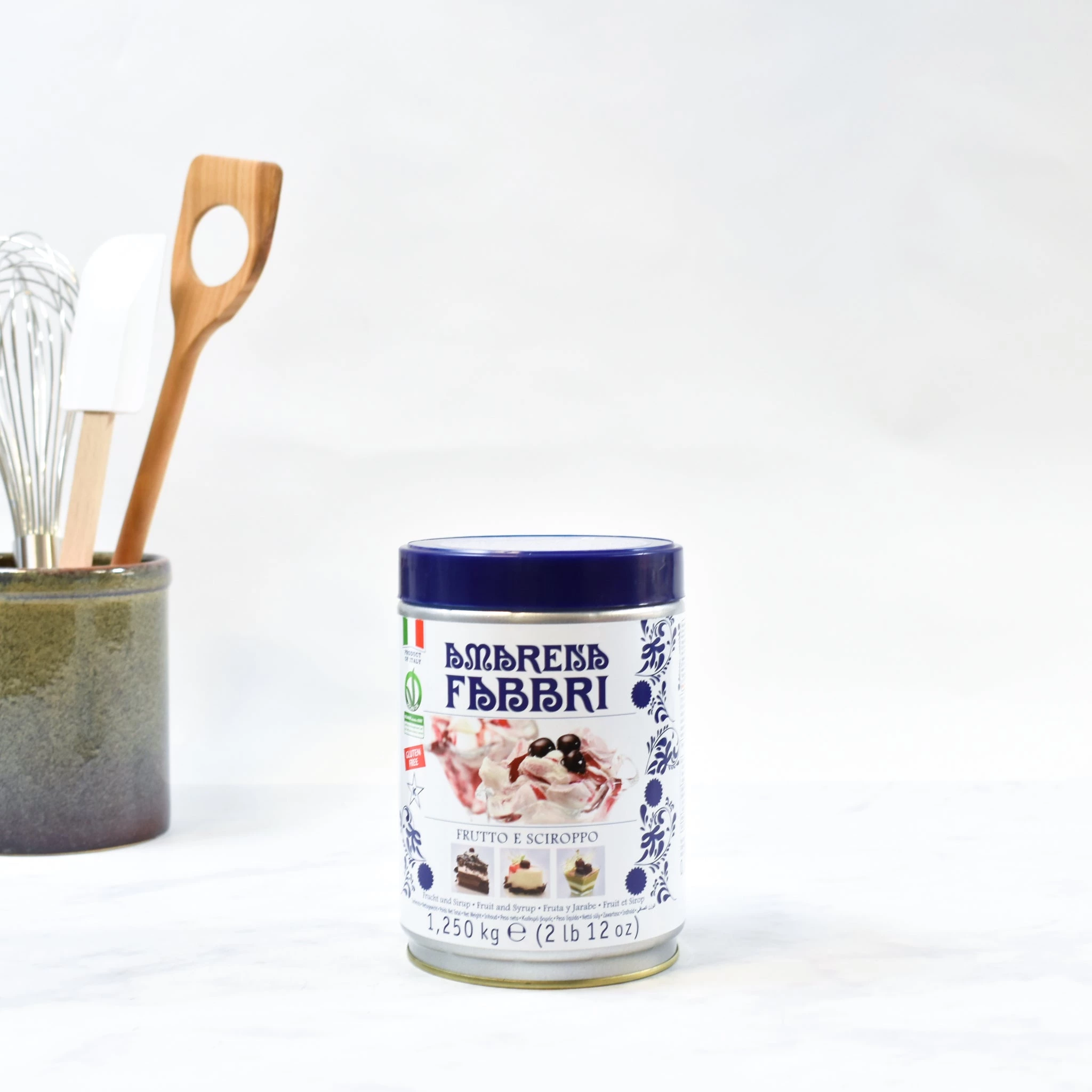 Fabbri Amarena cherries in syrup are world famous demi-glacé cherries in a a huge 1.25kg tin. The Amarena cherries are soft and juicy, with a pleasing sourness that balances the sweet syrup.