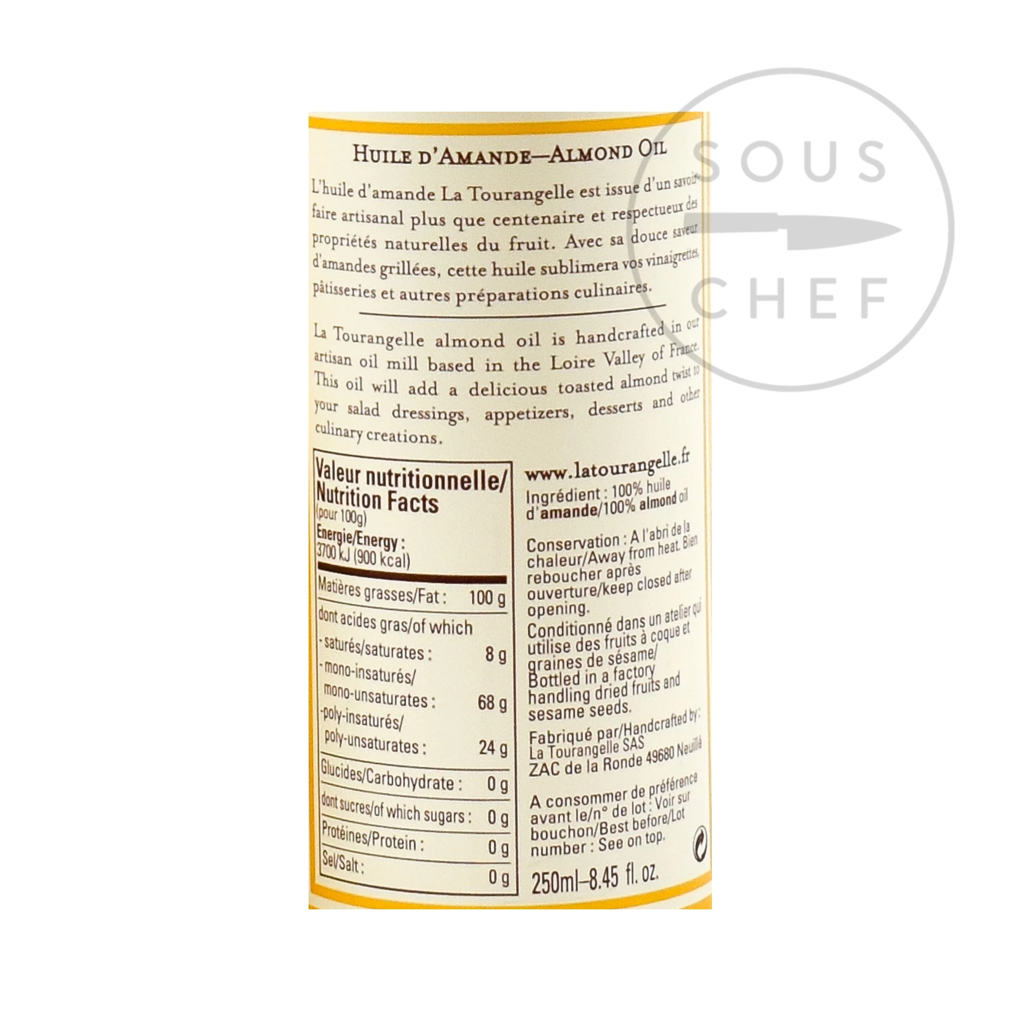 La Tourangelle almond oil is hand crafted in the Tourangelle artisan oil mill based in the Loire Valley in France. The pure almond oil is made from gently toasted almonds, to bring a light almond twist to salad dressings, appetisers, desserts and other dishes.