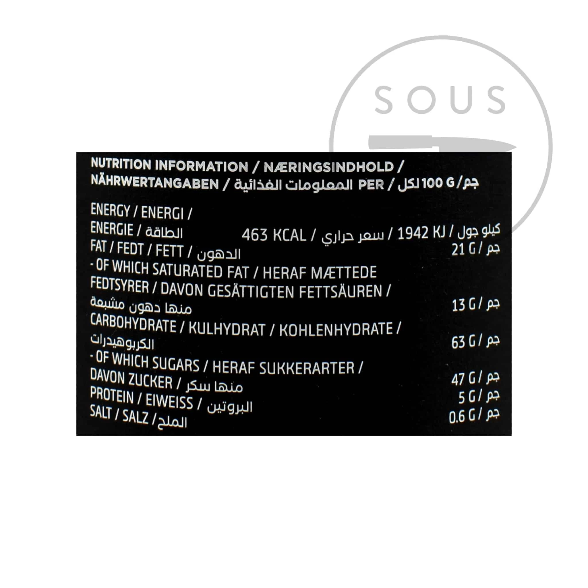 Ingredients: 61% dulce chocolate (sugar, milk powder, cocoa butter, whey powder, cacao mass, milk fat, emulsifier: soy lecithin, natural flavour), rice flour, invert sugar syrup, sugar, treacle, glucose syrup, 3.4% raw liquorice, 0.9% sea salt, rapeseed oil, salt, dextrose, alkalised cocoa, glazing agent: shellac, anise oil. Minimum 27% cocoa solids. Gluten free.