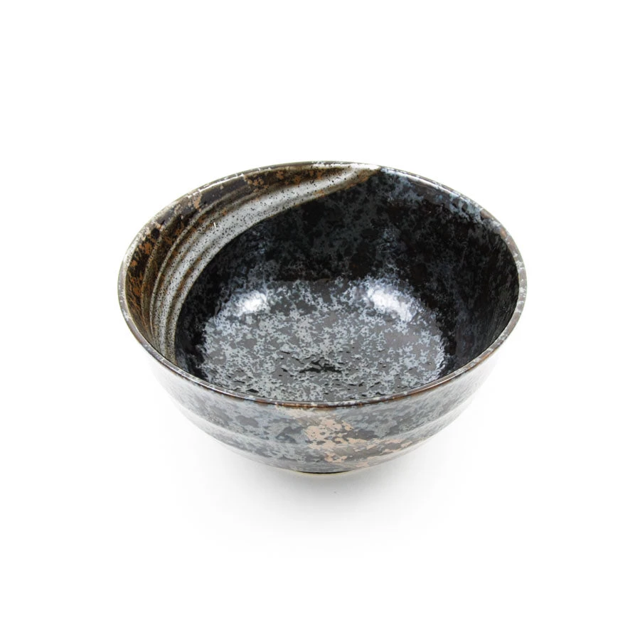 Karasuba-Iro signifie noir brillant en japonais, et ce bol de ramen en céramique vitrée a une belle surface tachetée noir brillant et gris. Des détails brun-rouge supplémentaires et des balayages blancs ajoutent à l’élégance du design.
