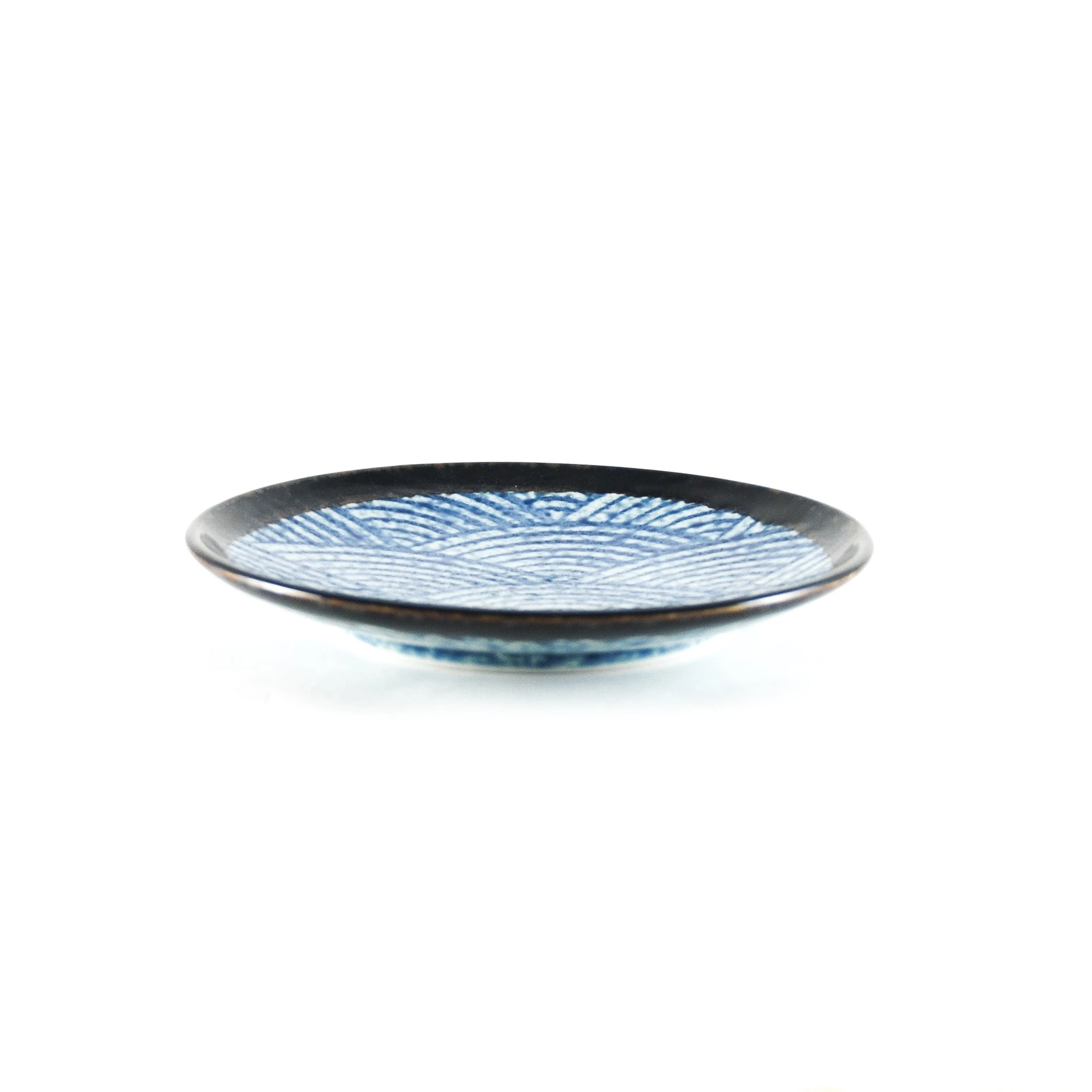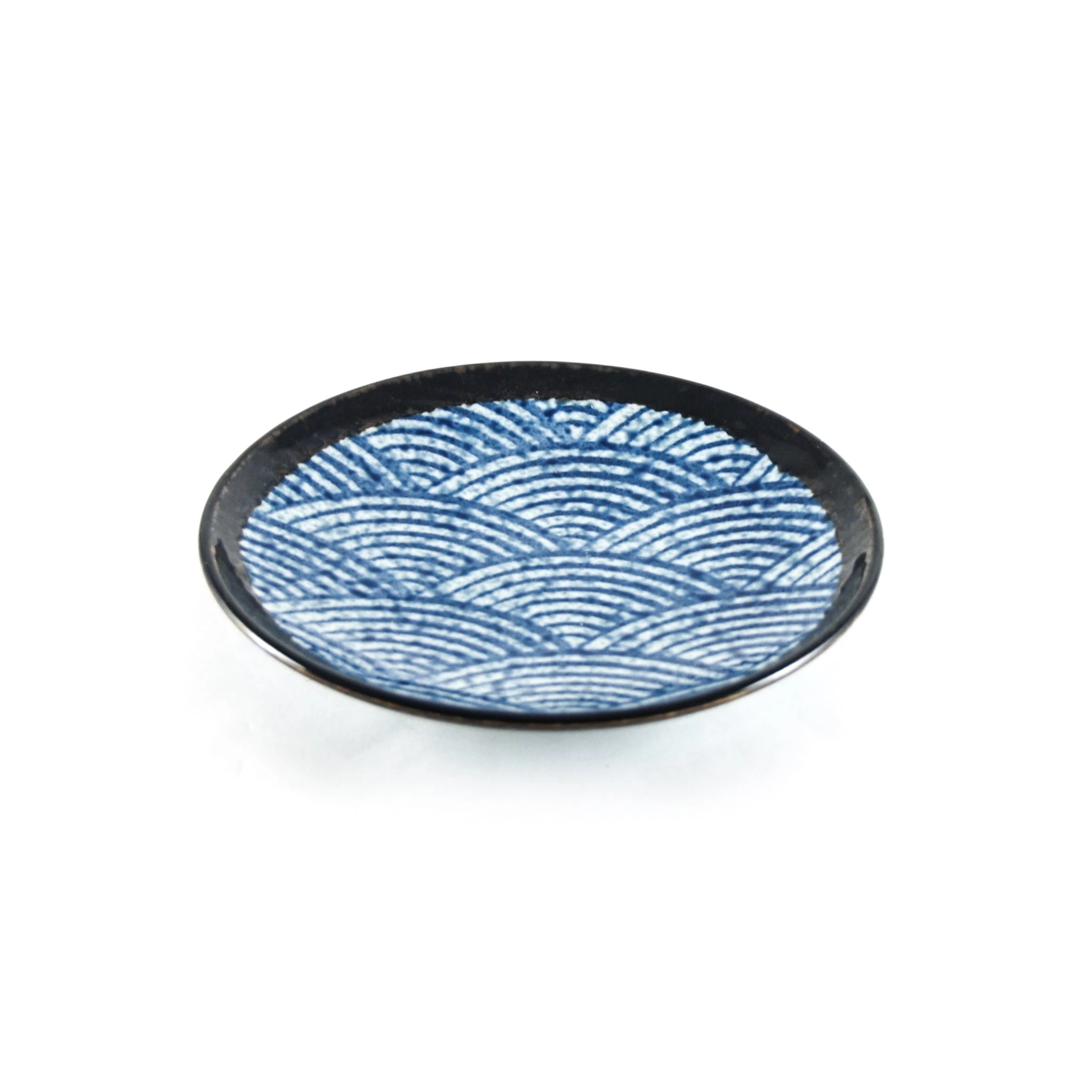 Le sid rondLa plaque est décorée d’un vernis blanc et bleu texturé dans un motif d’onde stylisée. La plaque est finie avec un bord brun-noir brillant.