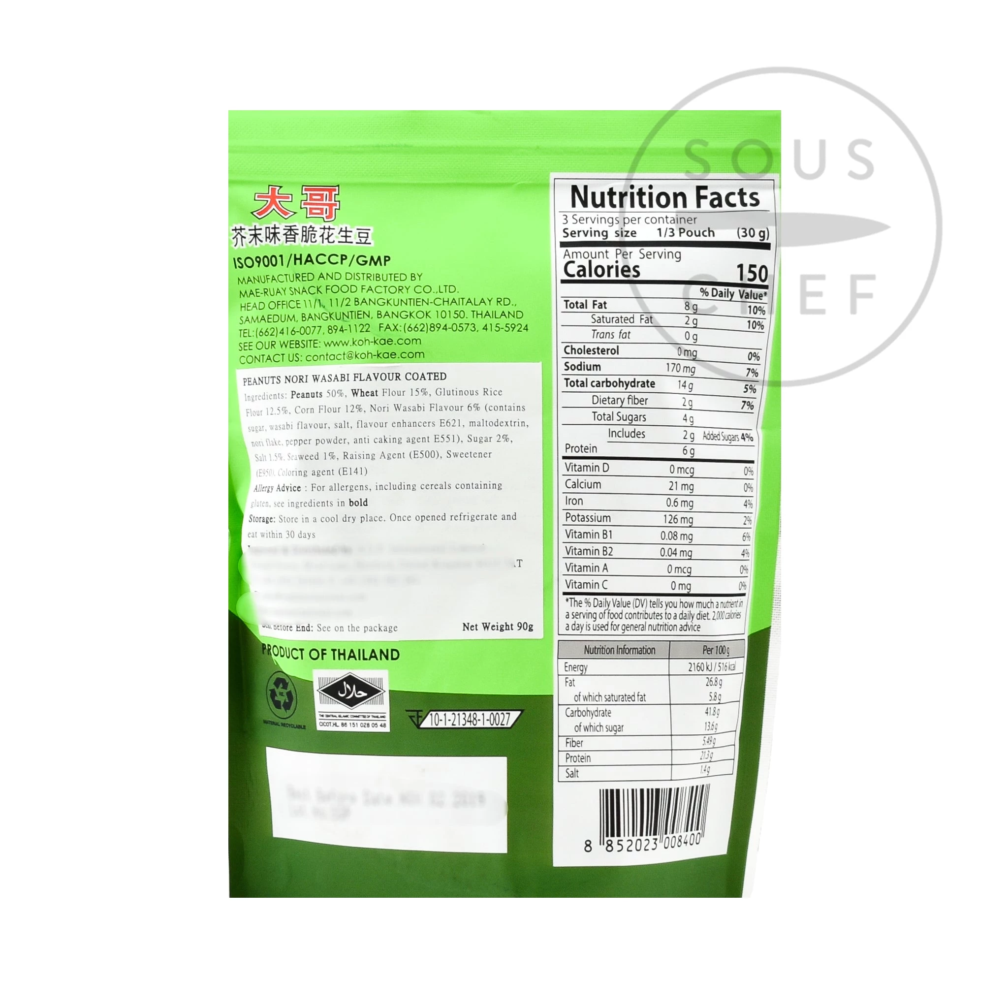 Ingrédients: Peanuts (50%), Wheat flour, riz glutineuxfarine, farine de maïs, saveur de nori wasabi (6 %) (sucre, saveur de wasabi, sel, amplificateur de saveur e621; maltodextrine, nori flake, poudre de poivre, agent anticaking e551), sucre, sel, nori (algue), édulcorant: acésulfame potassium e950; agent élevant: bicarbe de sodiumOnate e500; couleur: complexes de cuivre de la chlorophylline e141. Les allergènes sont énumérés dans bold.