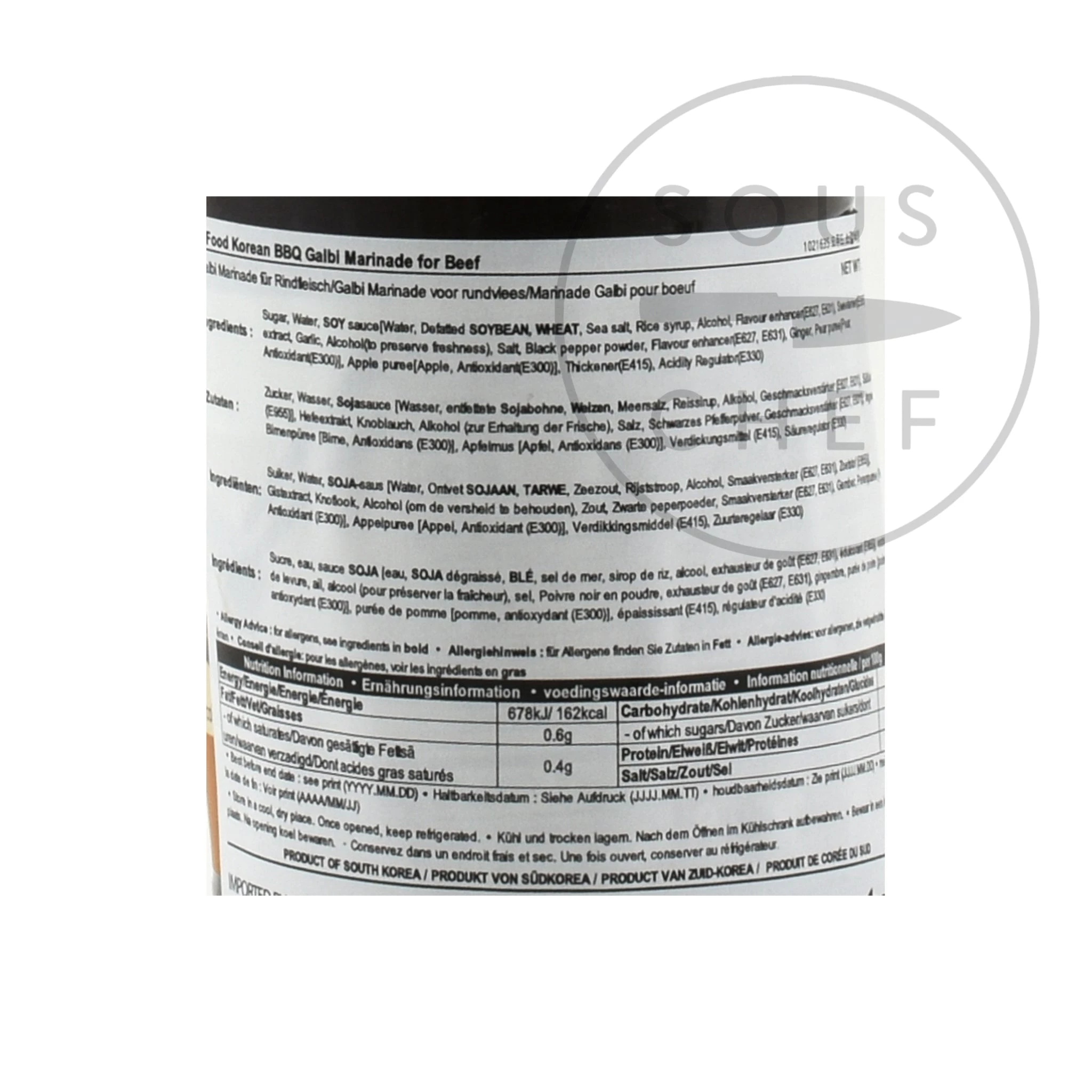 Ingredients: Sugar, soy sauce (water, defatted soybean, wheat, sea salt, rice syrup, alhohol, flavour enhancer (E627, E631), sweetener (E955), water, salt, yeast extract, garlic, alcohol (to preserve freshness), ginger, black pepper powder, flavour enhancer (E627, E631), modified corn starch (E1422), acidity regulator (E330), thickener (E415). Allergy advice: For allergens see ingredients in bold.