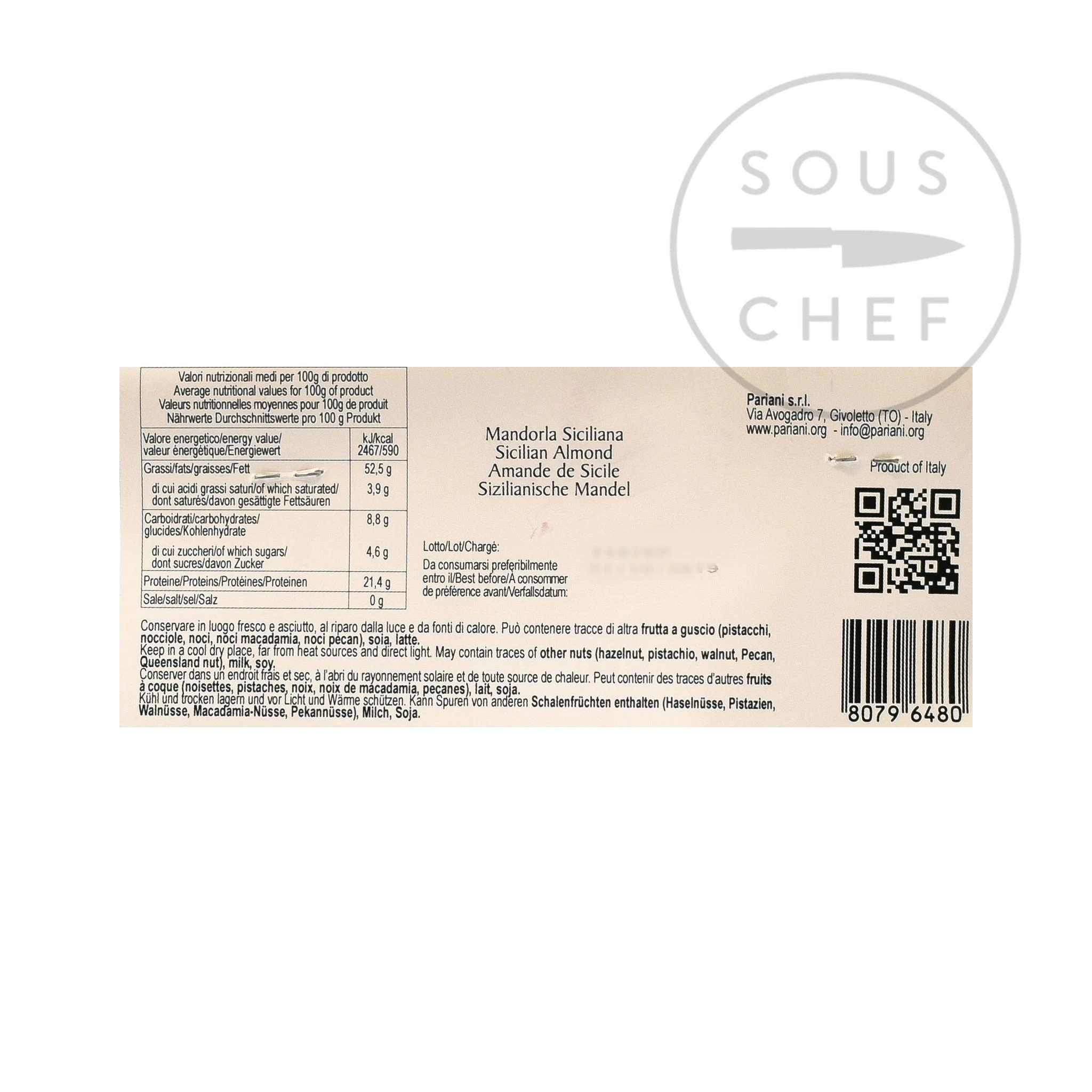 Ingredients: Sicilian almonds. Contains allergens: nuts.