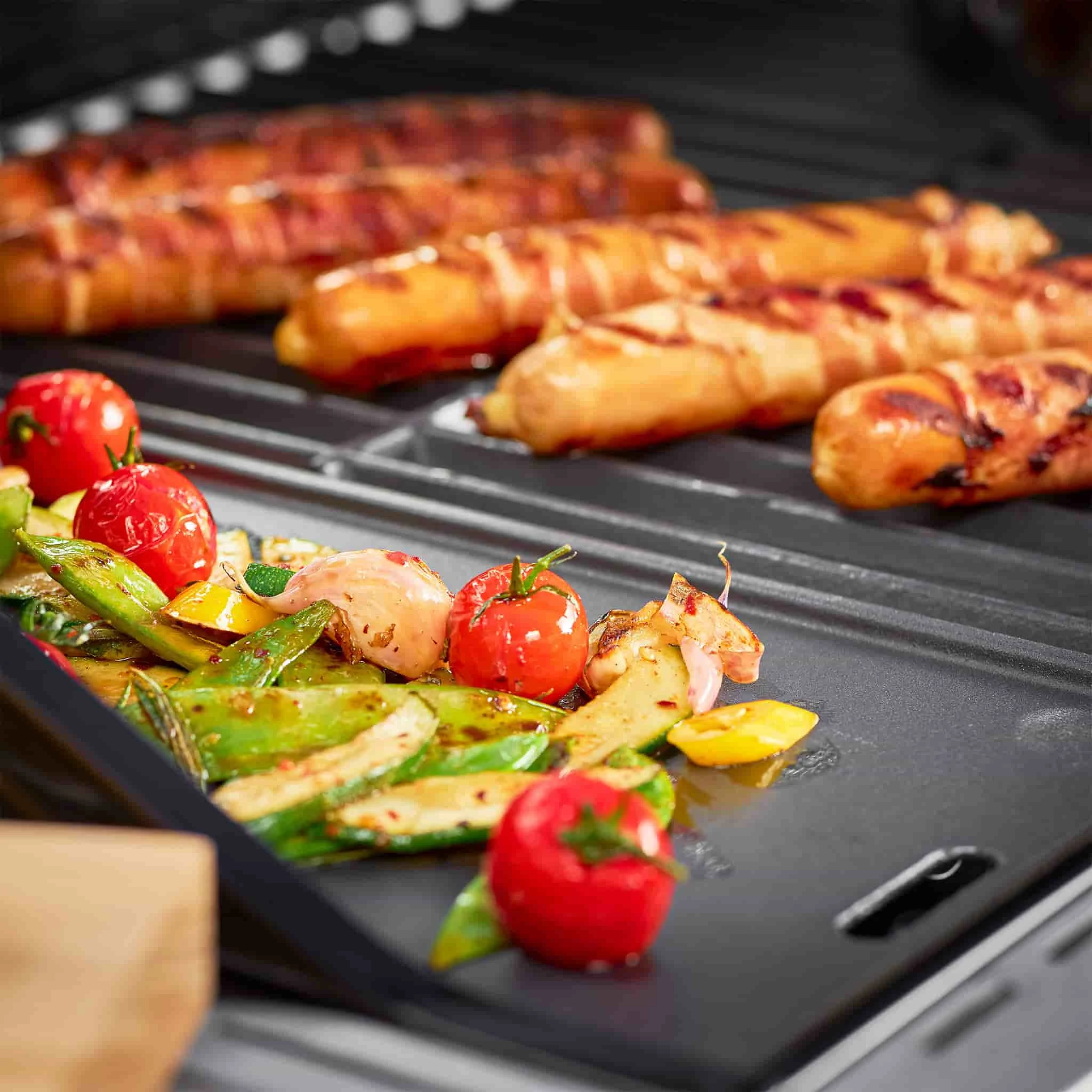 Utilisez le côté lisses pour les petits ingrédients – crevettes, ailes de poulet, poivrons entiers et courgettes tranchées. Le côté rainuré est idéal pour donner de plus grandes coupes de viande un extérieur carbonisé avec des lignes classiques de «grill».