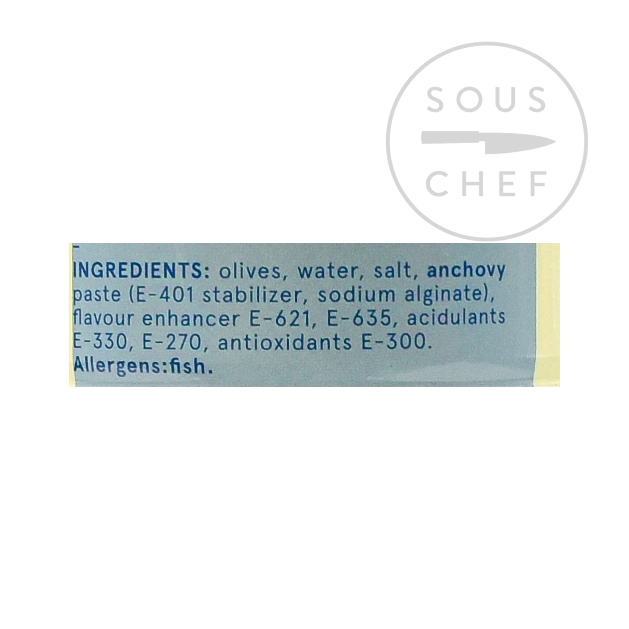 Ingredients: olives, water, salt, anchovy paste (E-401 stabiliser, sodium alginate), flavour enhancer E621, E635, acidulants E330, E270 and antioxidant E300. Contains allergens: fish.