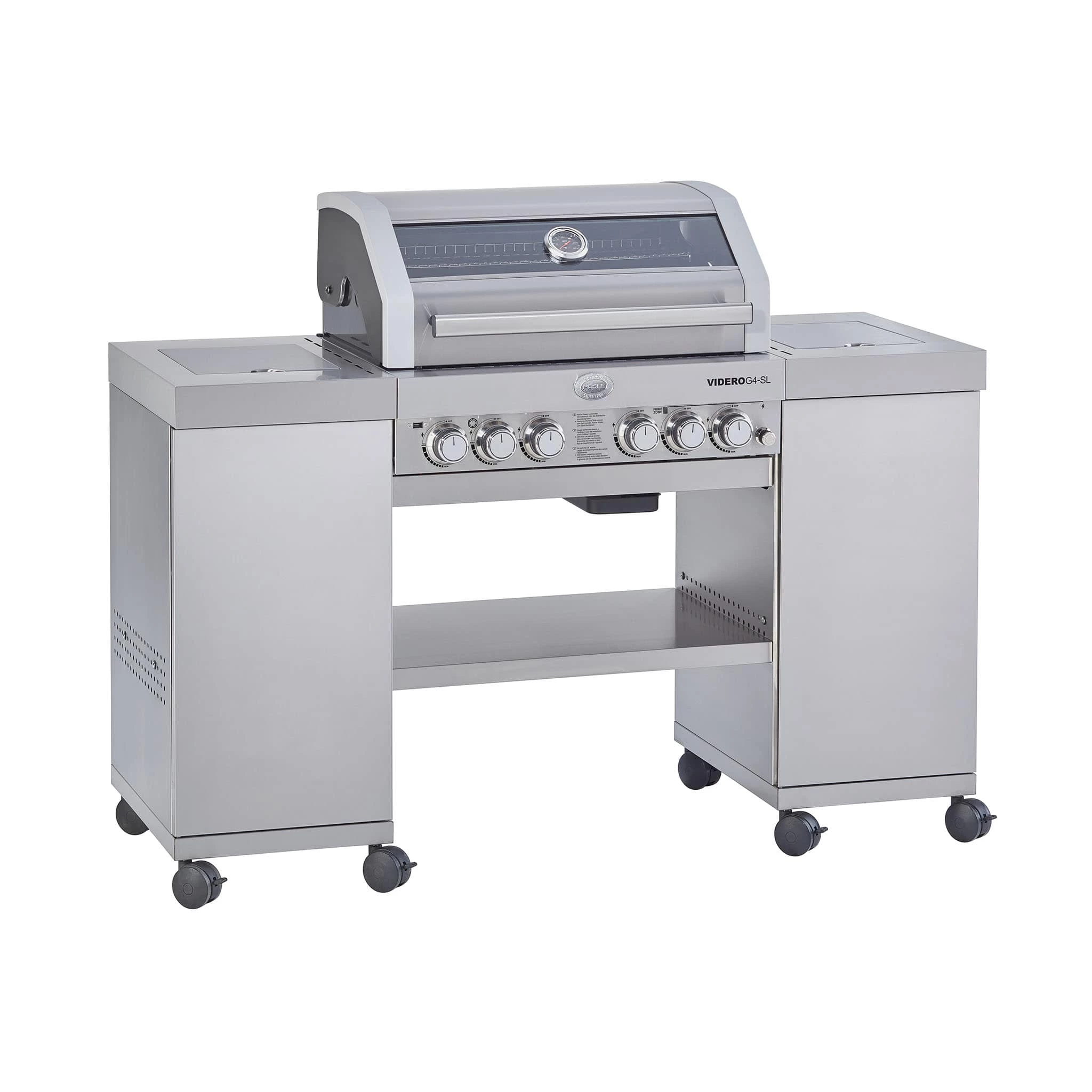 Rosle= »s Videro G4-SL Vario+ L’île de barbecue au gaz en acier inoxydable est la cuisine extérieure ultime pour les amateurs de barbecue.Brûleurs en acier inoxydable, vous permettant de cuisiner n’importe quoi de l’agneau koftas aux hamburgers halloumi, du bar entier aux saucisses bratwurst à différentes températures, tout au long de la chaleur directe.