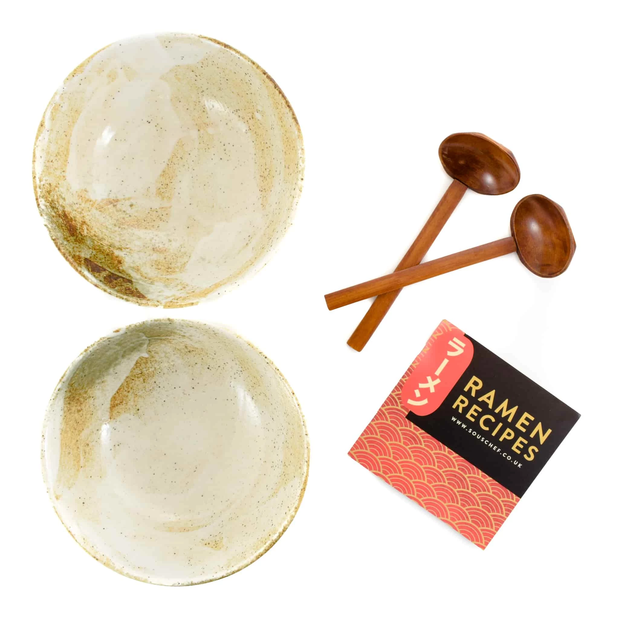 Le magnifique ensemble contient deux bols de ramen Yukishino, deux louches de ramen et un livret de recette de ramen en couleur. Tous emballés ensemble dans un tirage réutilisableNg sac cadeau en coton.