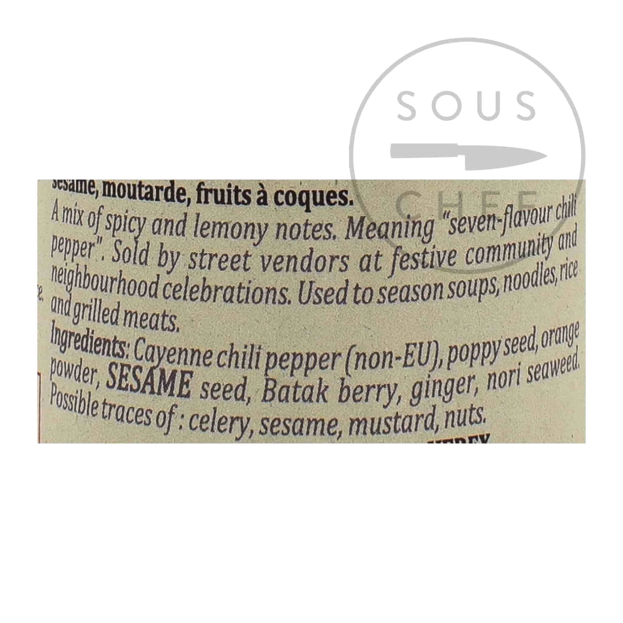 Ingrédients: Cayenne chili pepPar, graines de pavot, poudre d’orange, sésame graine, baie de Batak, gingembre, nori-algue.