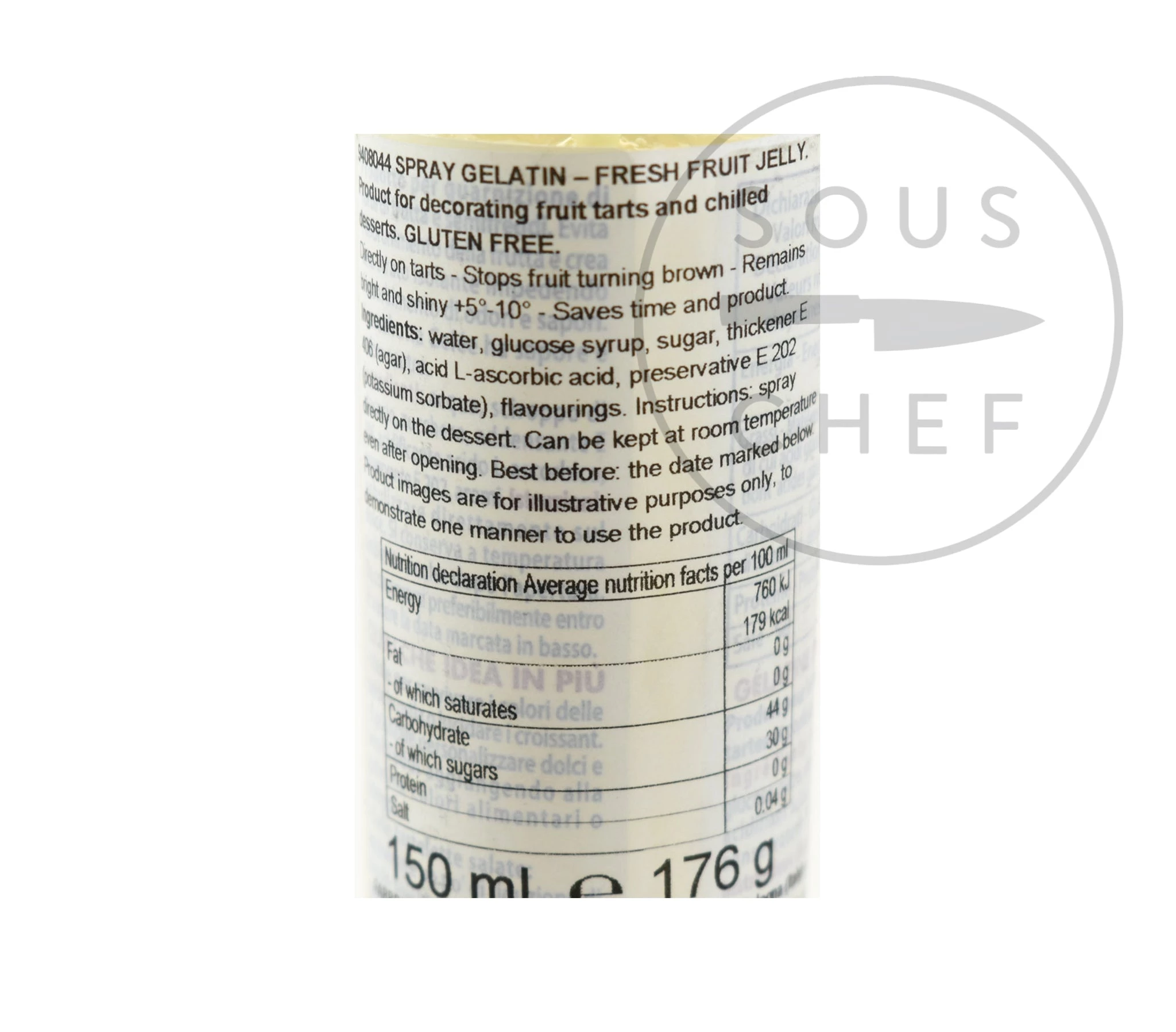 Le spray en gélatine fabbri donne des tartes aux fruits frais que la finition scintillante signature que vous voyez dans les fenêtres de pâtisserie française. Utilisez-le pour créer une brCette vaporisateur de gélatine empêche également les fruits frais de décolorer ou de brunir dans l’air – excellent si vous voulez afficher votre création avant de la manger. Pour l’utiliser, vaporisez simplement directement sur des tartes pour une brl’aspect brillant.